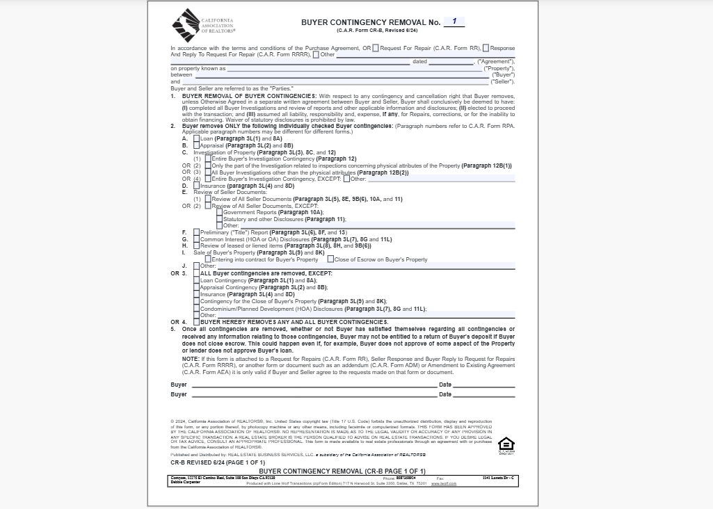 Seller Disclosures — All properties are sold "as is" and "as disclosed." This contingency covers the Transfer Disclosure Statement (describing the current condition of what's being sold) and the Seller Property Questionnaire (detailing the history of modifications and repairs).